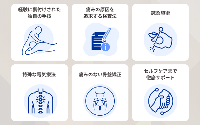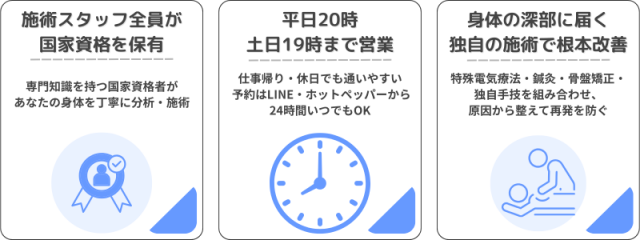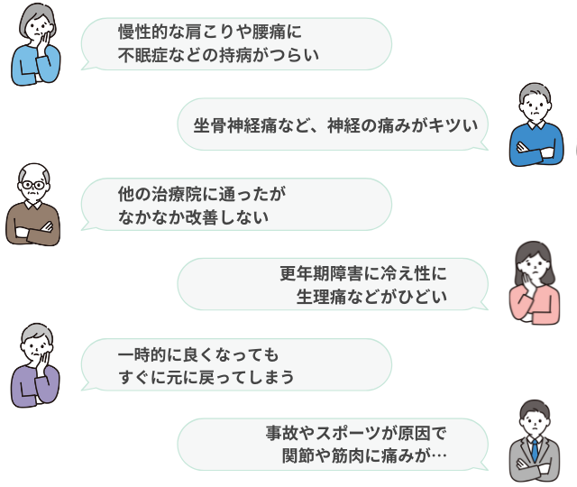 急性の痛みや慢性的な痛みコリのお悩みは安心して相談してください。